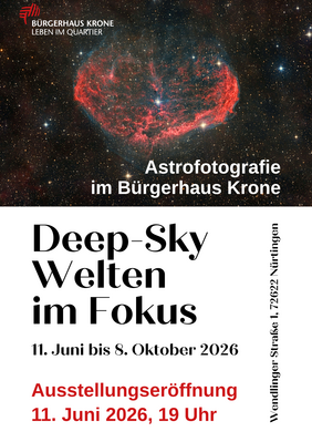 Andreas Cordt, Andreas Geßner und Bernd Wolfer aus dem Astro-Treff stellen ihre Astrofotografien aus. Gezeigt werden bis 8. Oktober Bilder beispielsweise von Galaxien, Kugelsternhaufen, Planetarischen Nebeln und Supernova-Resten.